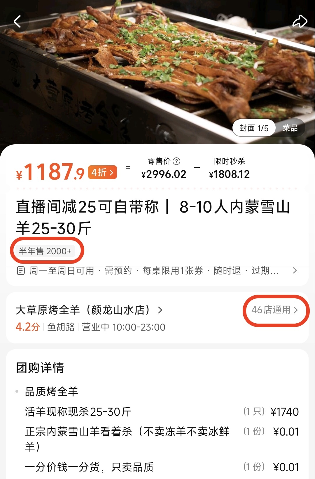 据公开数据,大草原烤全羊为连锁店,该1188元烤全羊套餐,半年内在46家门店售出超2000单。