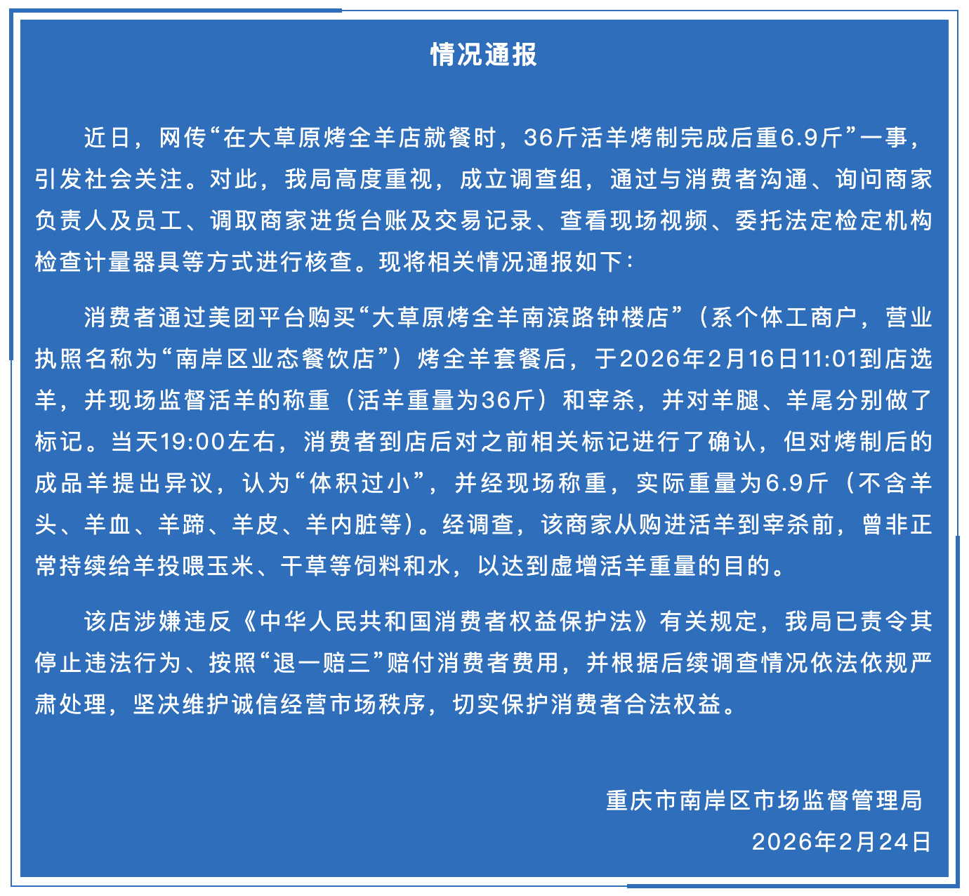 2月24日,重庆市南岸区市集监督处置局发布通报,阐明涉事商家在活羊购进至屠宰前,曾“非平常握续投喂玉米、干草和水”,以虚增活羊分量,涉嫌违抗《蓦地者职权保护法》关连限定,已责令住手违警行径,并按照“退一赔三”圭表抵蓦地者赔付,同期将证据后续拜谒情况照章依规严肃处理。