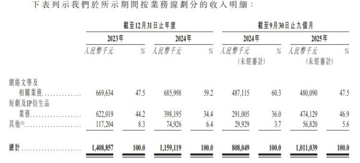 而华文在线招股书称,“截止2025年9月30日的九个月内,本公司总收入为东说念主民币1,011.0百万元。其中,鸠集文体及推断业务收入与短剧及IP滋生品业务收入分辩达东说念主民币480.1百万元及东说念主民币474.1百万元,分辩占咱们总收入的47.5%及46.9%。”这一数据或意味着,华文在线不再仅仅国内网文平台与零星滋生开荒,而是在将网文、短剧、IP开荒置入团结缠绵鸿沟之中。