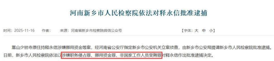 到了旧年 11 月,第二份通报由新乡市稽察院发布,释永信被追究批准逮捕。