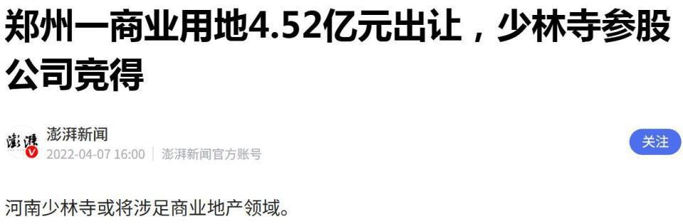 2022 年,少林寺琢磨公司更所以 4.52 亿元拍下郑州中枢肠段贸易用地。
