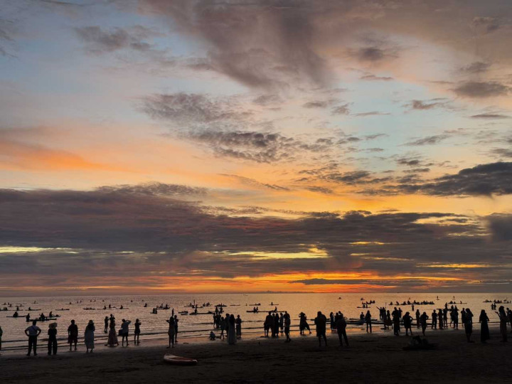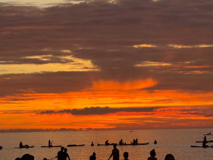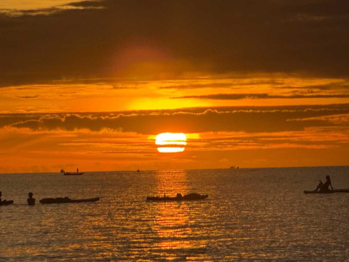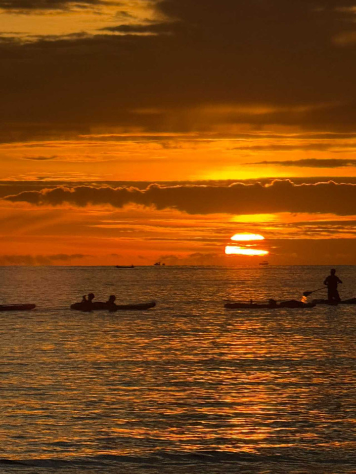 等了差未几一个小时吧,太阳就渐渐落下了,阳光渐渐铺洒在海面上,海上还有玩着板浆的游东说念主,他们背光的玄色背影与日落交汇在沿途,酿成了一副完好意思的画面,与咱们第一天看到的情状酿成了纷乱的对比,这才是天下前十的日落啊!!!今灵活是太运道了,要知说念在雨季的亚庇,日落豪赌生效的概率不会很大,目下能看到我嗅觉我方险些是天下上最运道的孩子。。。。