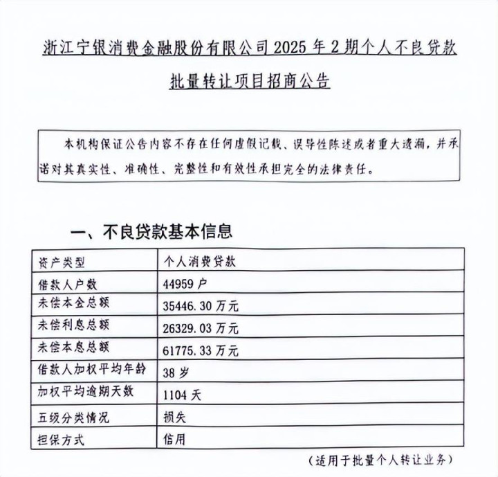 同月,浙江宁银消耗金融股份有限公司(宁银消金)线路2025年第1期、2期个东说念主不良贷款批量转让阵势,未偿本息总数辞别为6.19亿元、6.18亿元,加权平均落伍天数辞别为1103天、1104天,均为亏空。