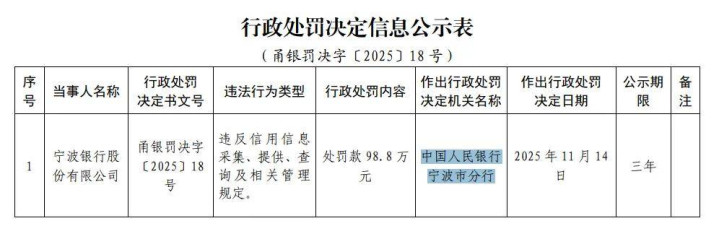 本人及子公司均遭罚。昔时的一年,宁波银行及分行收到多张罚单,2025年11月,公司因违抗信用信息集合、提供、查询及关联措置规则,被中国东说念主民银行宁波市分行罚金98.8万元。