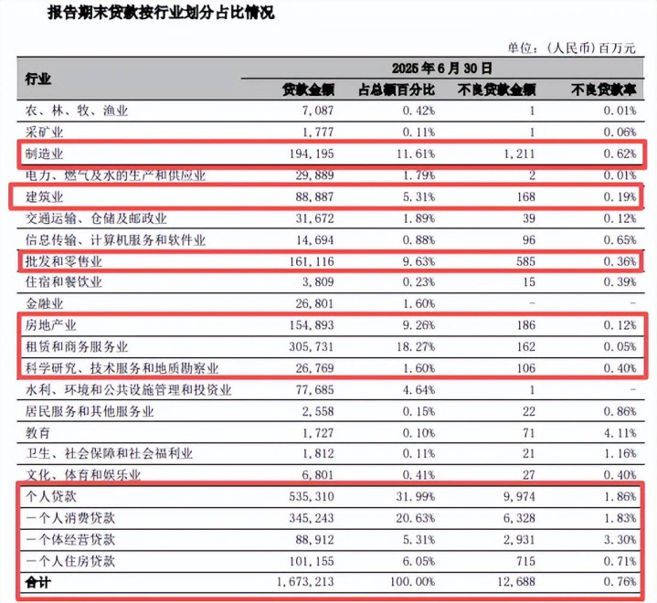 个东说念主不良贷款超99亿元。2025中报解析,宁波银行对公不良贷款主要聚首在造业、批发和零卖业,不良贷款金额辞别为12.11亿元、5.85亿元,不良贷款率辞别为0.62%、0.36%,另外不良贷款金额在1亿元以上的企业包括缔造业、房地产业、租出和商务办业绩、科学研讨、工夫工作和地质勘探业,辞别为1.68亿元、1.86亿元、1.62亿元、1.06亿元,不良贷款率辞别为0.19%、0.12%、0.05%、0.4%。