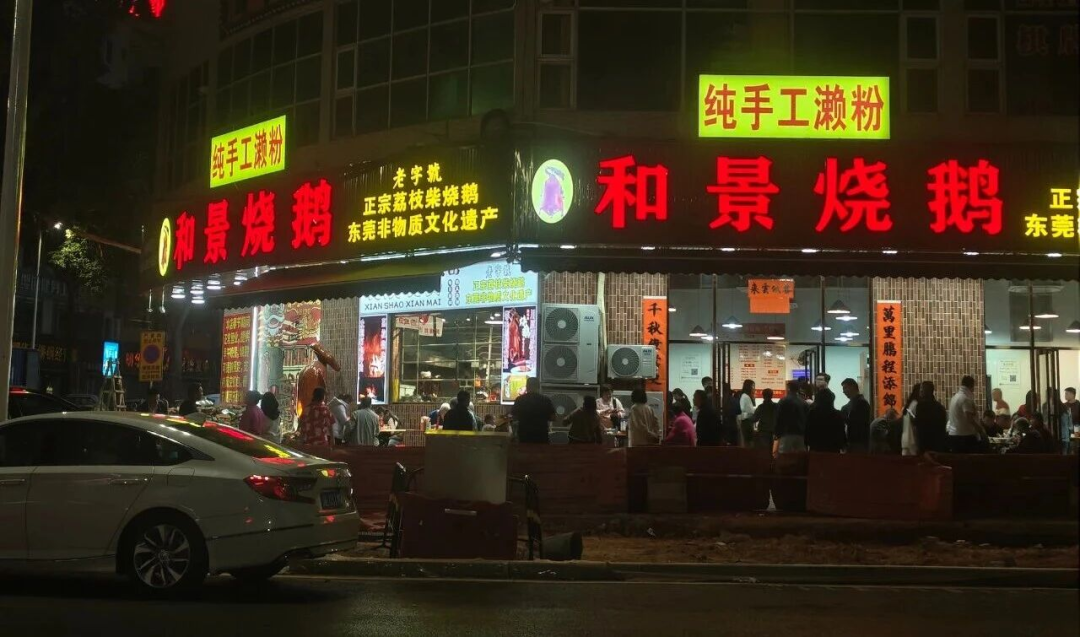 入夜后,位于横镇西路的和景烧鹅店门前就排起了长长的队伍,不少腹地住户和邻近搭客专程前来,只为一口醇正隧说念的荔枝柴烧鹅。