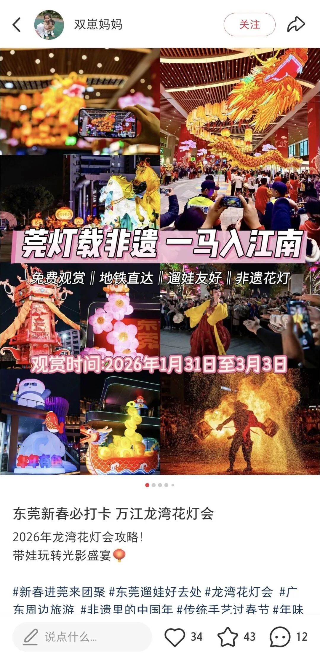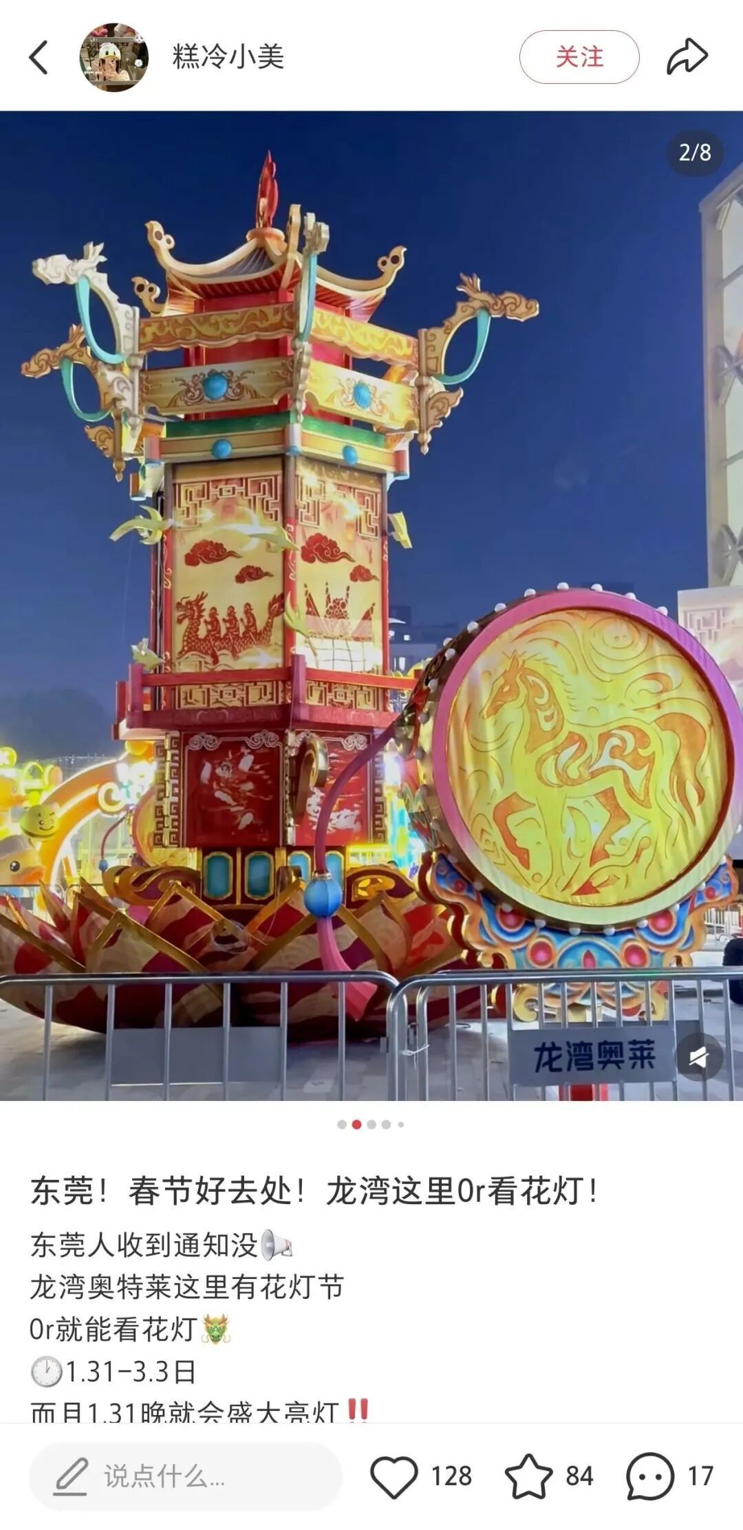 “刷抖音刷到这个花灯会,刚从江西回东莞,就和一又友过来了,花灯超过出片,还有英歌舞、川巨变脸这些扮演,逛累了就在傍边的奥莱吃点东西、逛逛街,免费又好玩。”