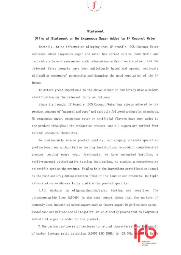 事件发酵后,IF椰子水在港交所发布澄莹公告,称媒体关联指称造作且具有误导性。